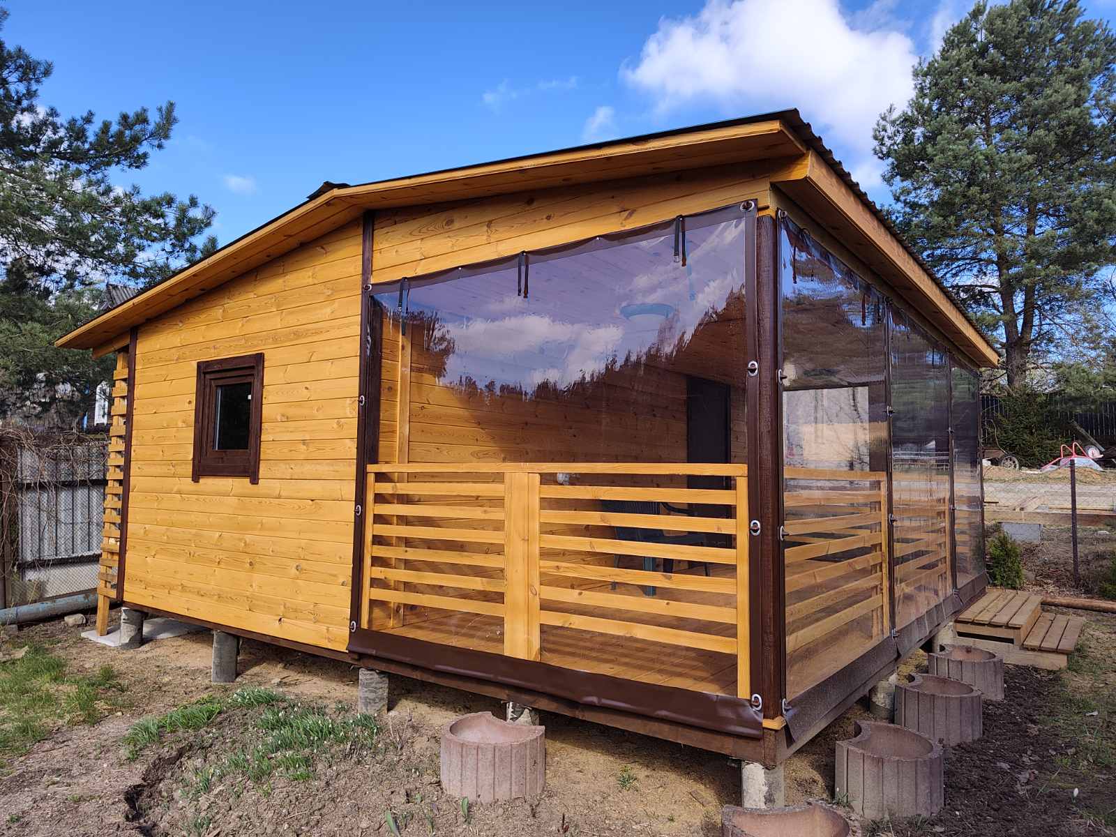 Готовый вариант каркасной бытовки 6×3 м с террасой 6×2,5 м — это два крытых пространства в одном: