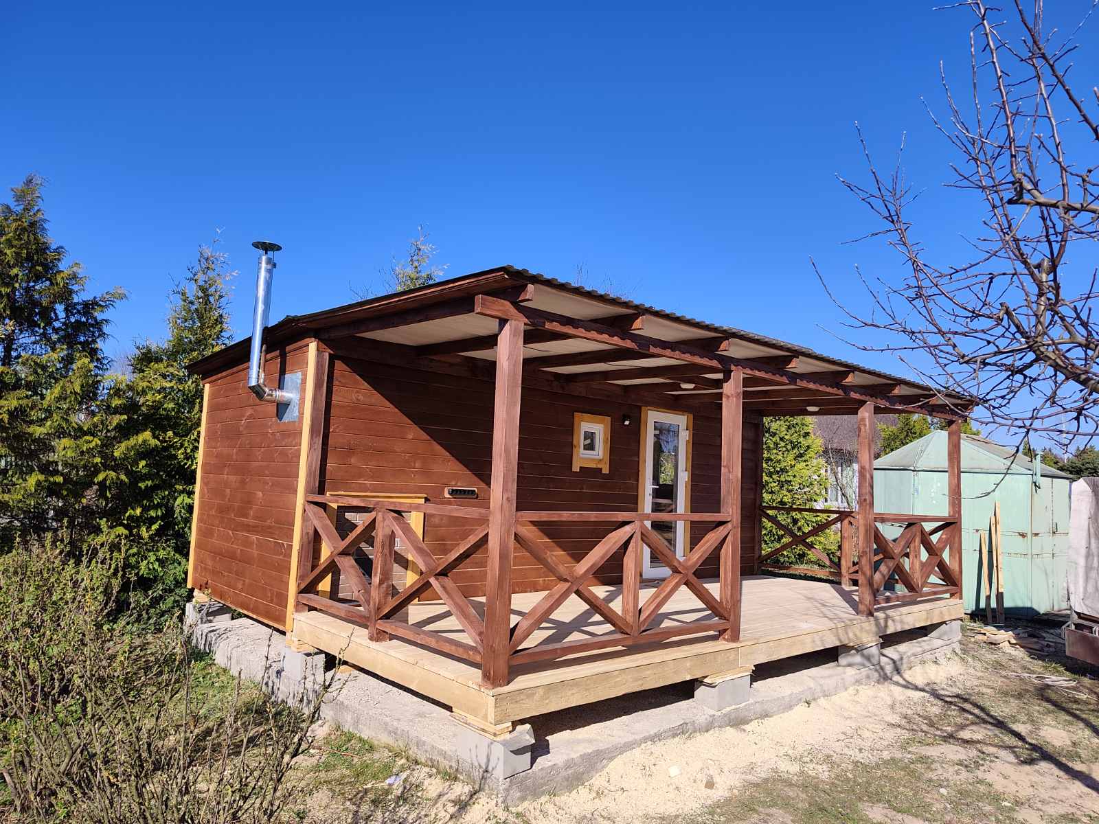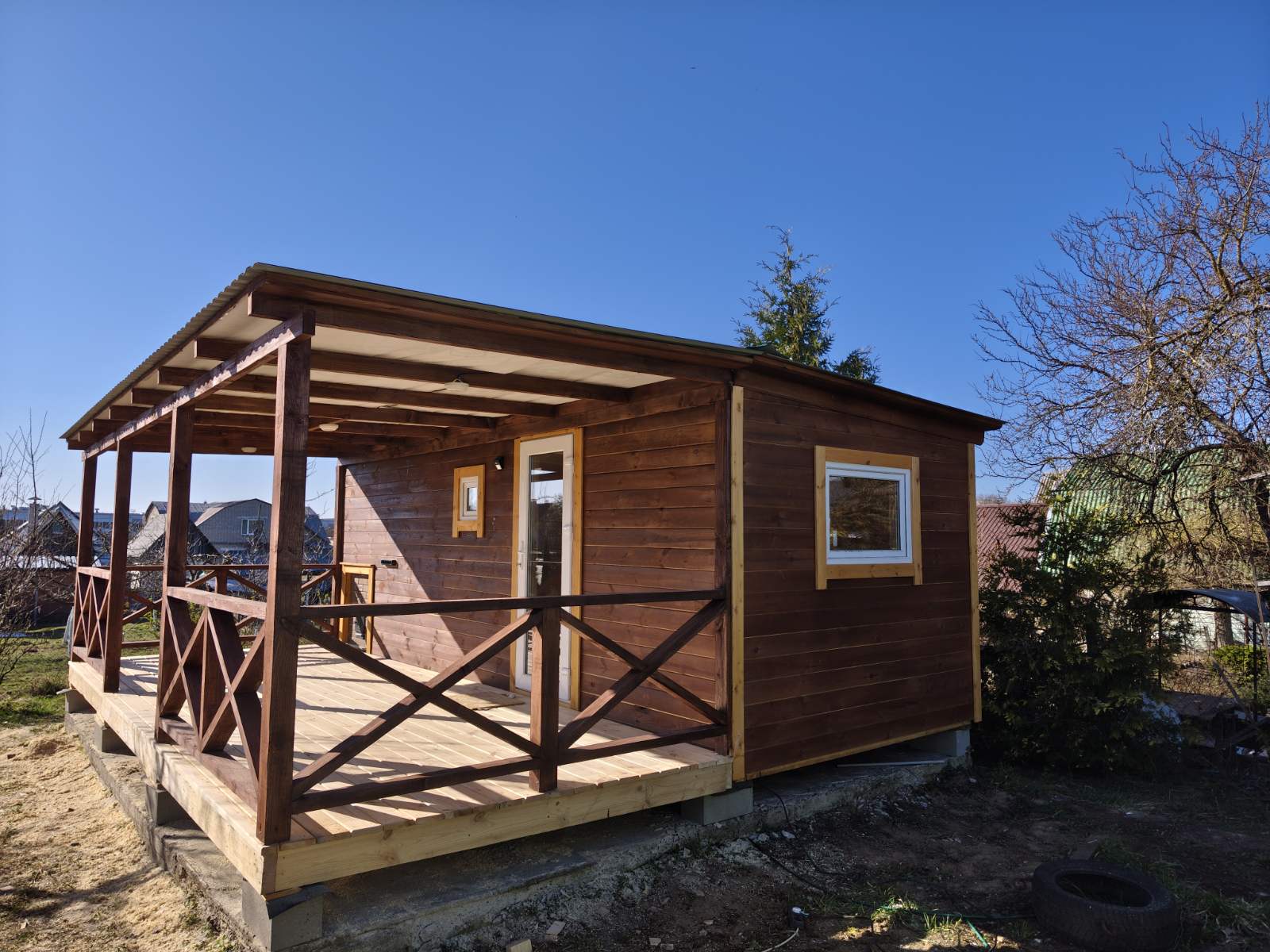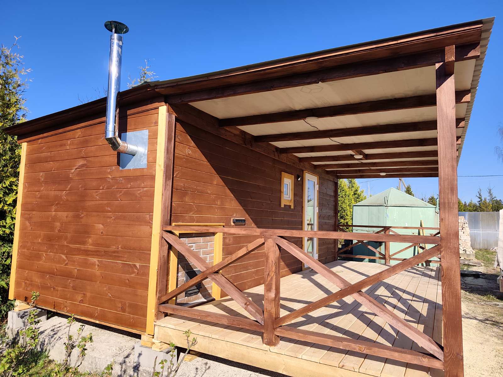 Стены обшиты имитацией бруса, двери окна свесы крыши углы строения обшиты доской хвойных пород древесины