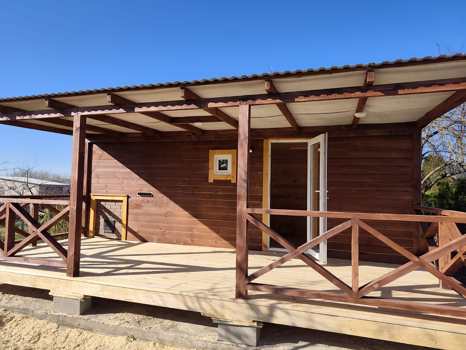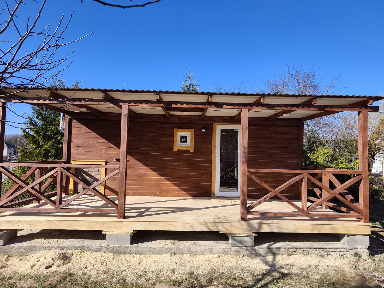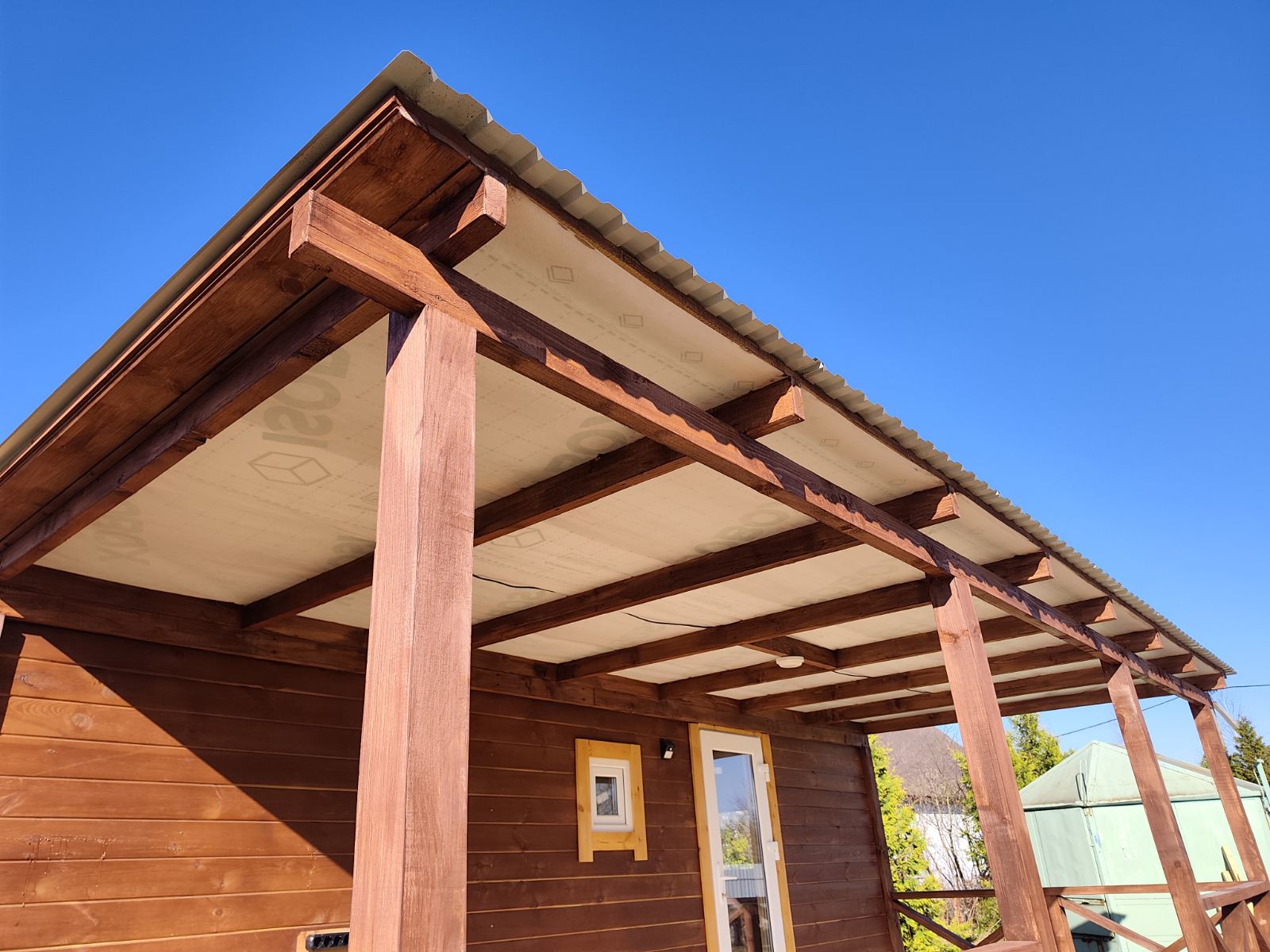 Стены обшиты имитацией бруса, двери окна свесы крыши углы строения обшиты доской хвойных пород древесины