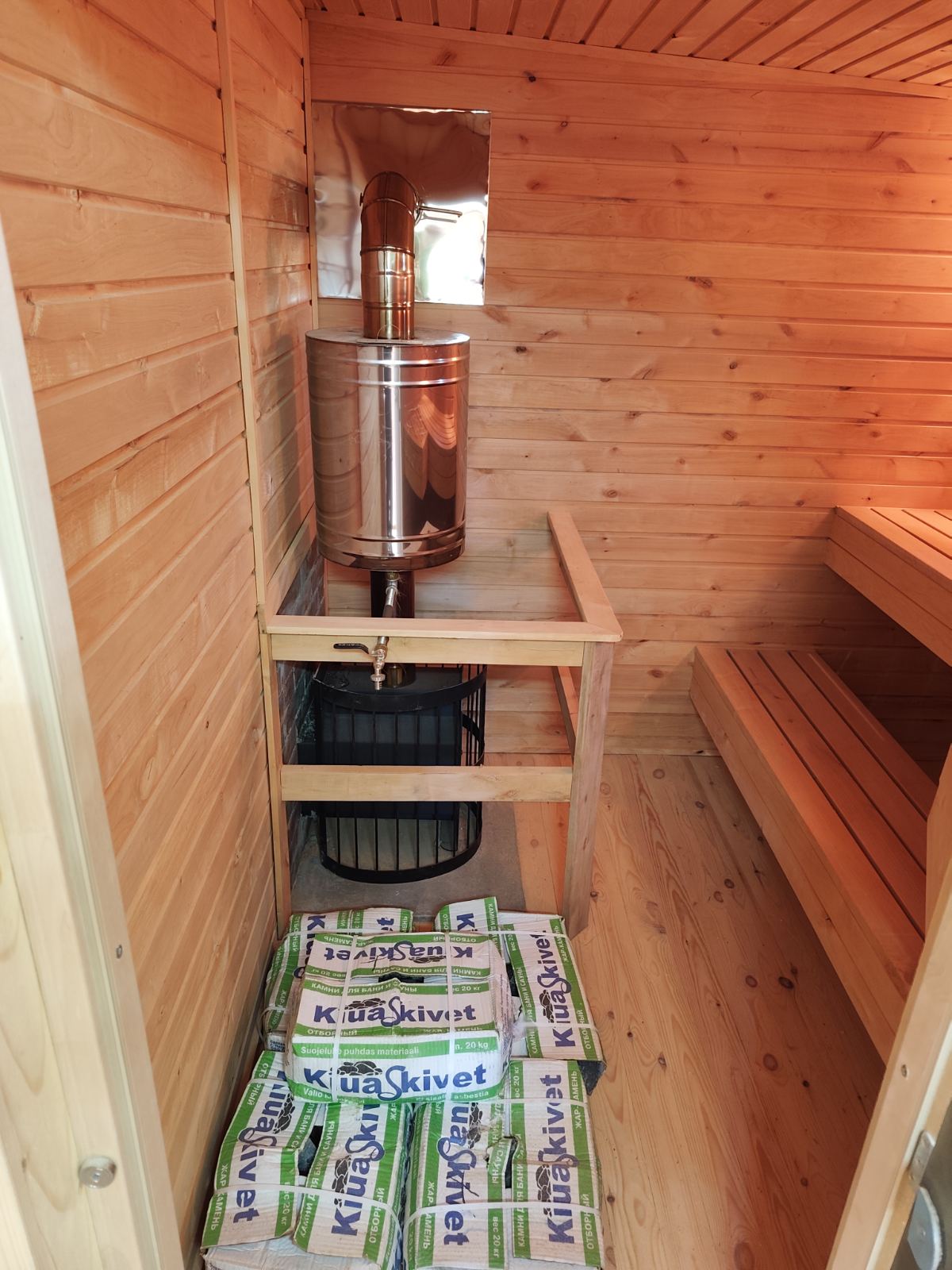 Двухъярусные полки из ольхи, печь чугунная «Этна Магма-14» или «Этна Кратер-14″ с баком самоварного типа для горячей воды 55 литров, Дымоход выведен в стену , 100 кг камней (3 коробки камней «Габбро- Диабаз» по 20 кг).