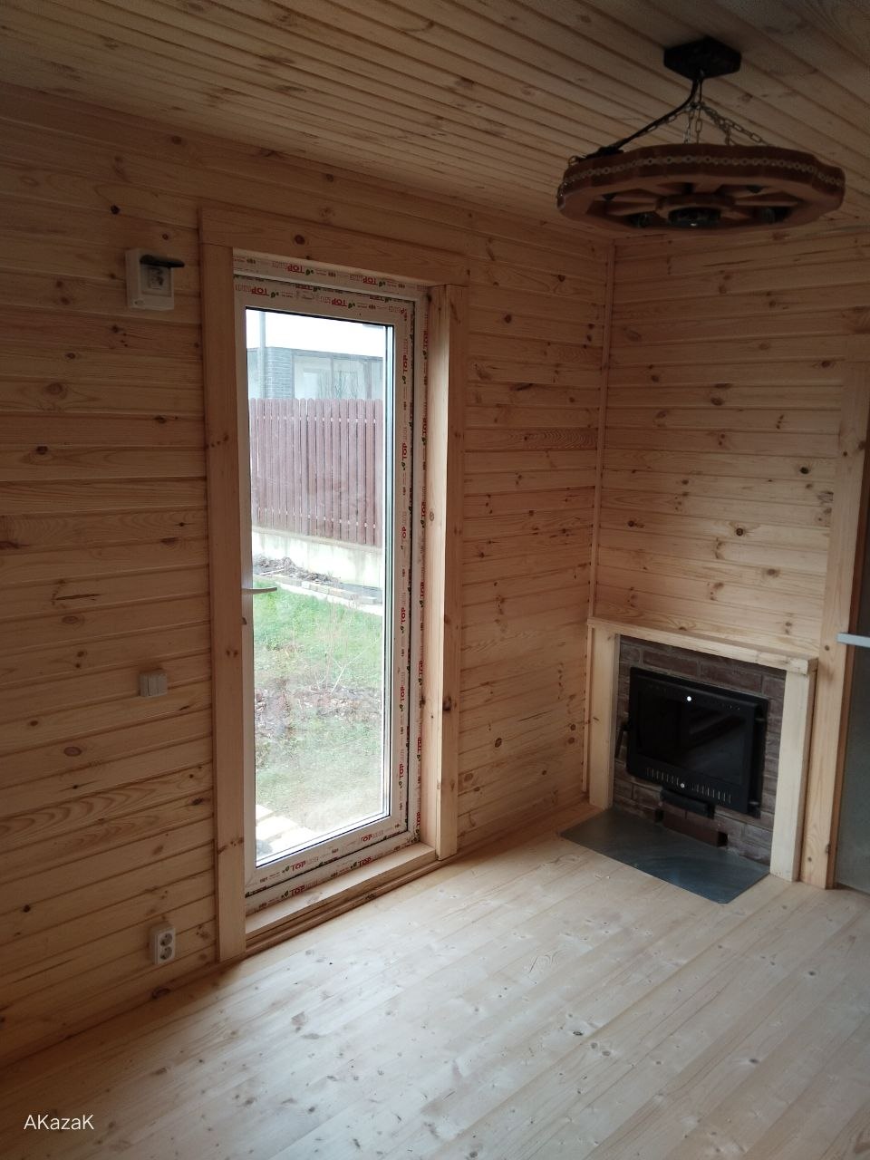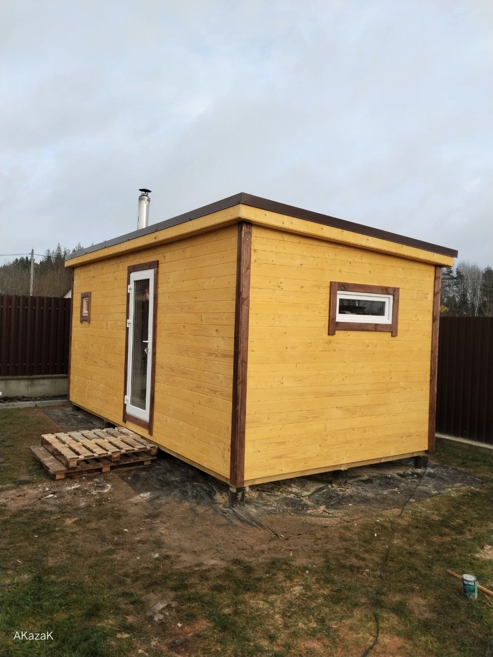 Стены обшиты имитацией бруса, двери окна свесы крыши углы строения обшиты доской хвойных пород древесины