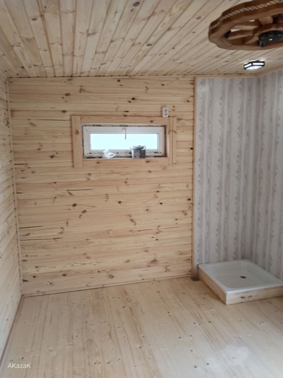 Раздевалка и моечное отделение: потолок, перегородки обшиваются вагонкой хвойных пород древесины. На стыки углов стен, потолка и пола прибивается плинтус. Парное отделение: потолок, перегородки и стены обшиваются ольховой вагонкой. Под вагонкой по периметру прокладывается фольгированная мембрана с эффектом энергосбережения. На стыки углов стен, потолка и пола прибивается плинтус.
