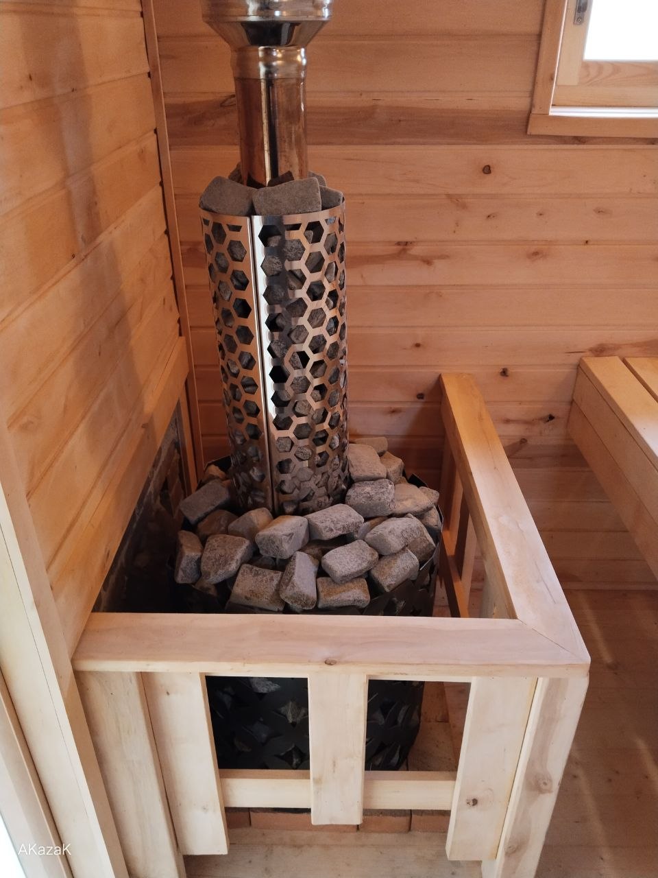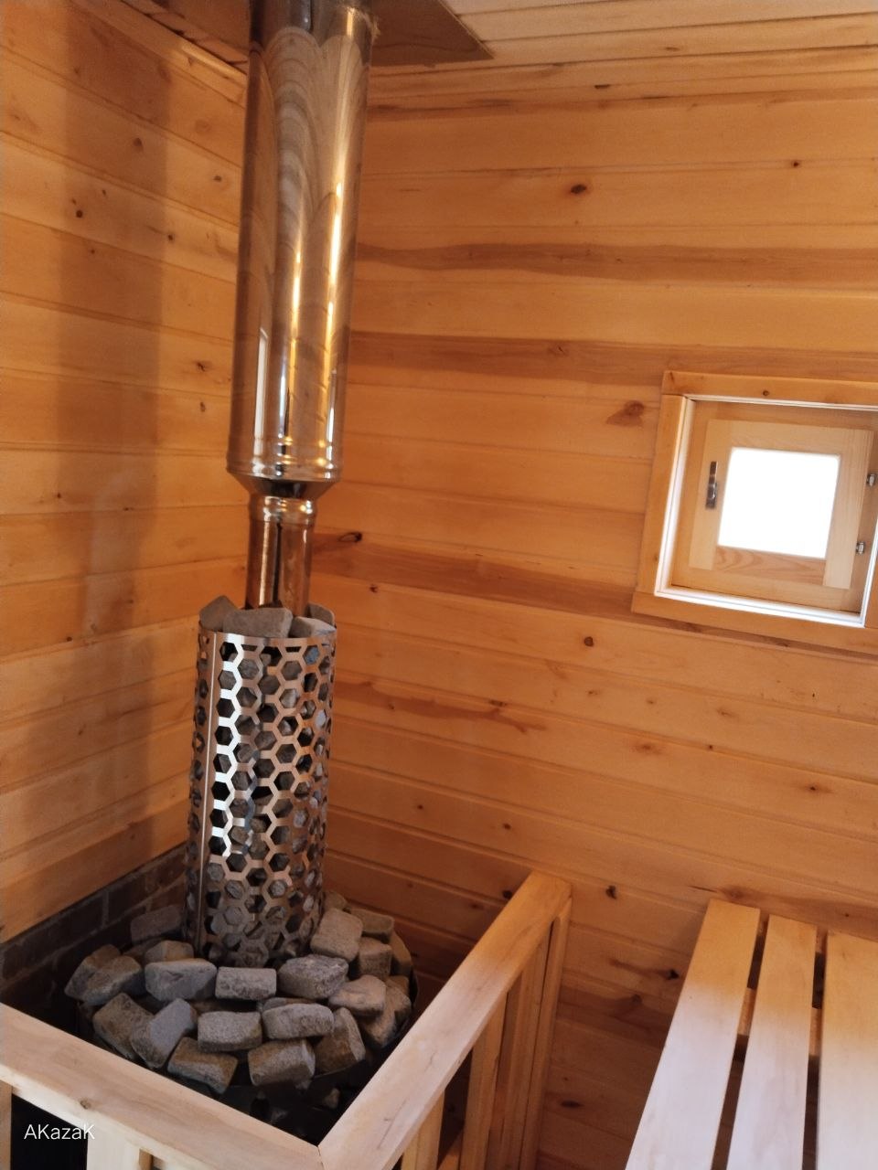 Двухъярусные полки из ольхи, печь чугунная «Этна Магма-14» или «Этна Кратер-14″ с баком самоварного типа для горячей воды 55 литров, Дымоход выведен в стену , 100 кг камней (3 коробки камней «Габбро- Диабаз» по 20 кг).